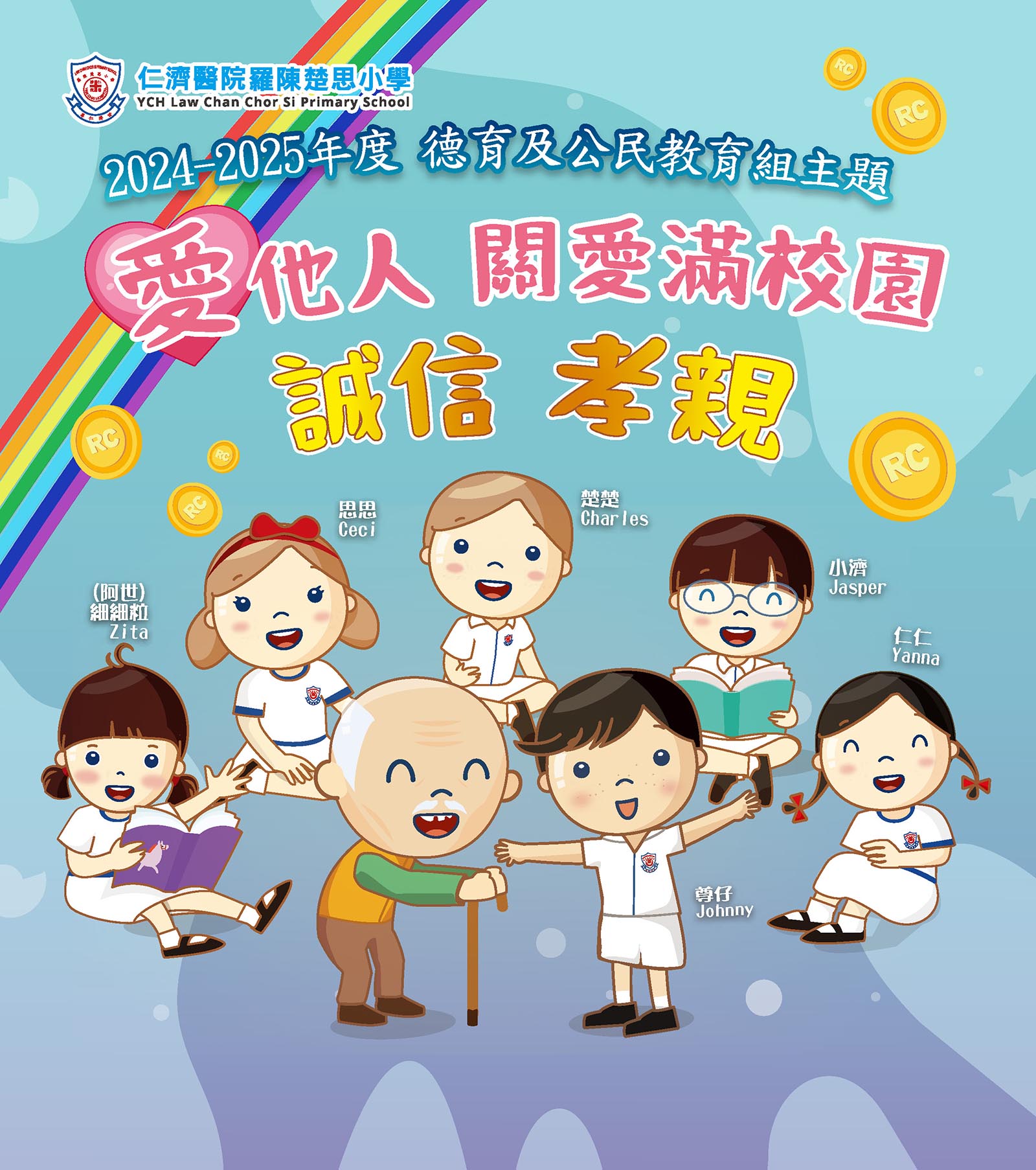 本校設計楚楚、思思與一眾同學互動的故事,配合全校德育主題,推廣正向校本價值教育。「楚楚、思思」是以我校創校的羅陳楚思女士名字來命名,希望讓學生對學校更有歸屬感,同時配合辦學團體的教育理念,我們的校訓–「尊仁濟世」,建構一眾角色,透過不同的德育活動,成長課等,藉此培養學生的仁德之心,關愛社會。